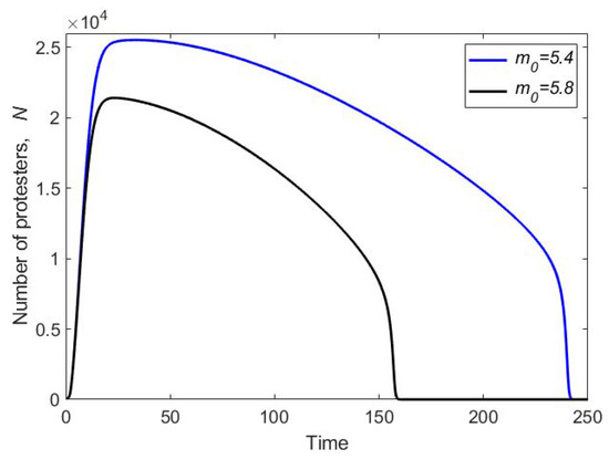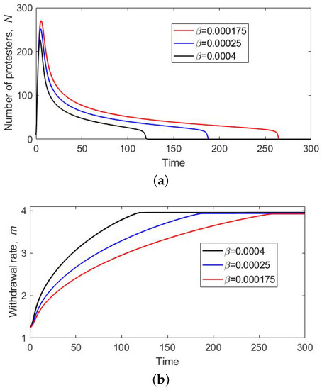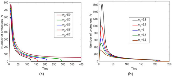 Solutions of Model (7) obtained for different values of : (a) the number of protesters N vs. time and (b) the per capita withdrawal rate m vs. time. Other parameters are , and .