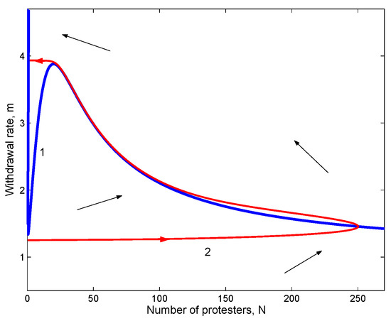 where is the initial value of the withdrawal rate. In case the initial value is small, which can occur as a reflection of high social tensions, is an increasing function. This seems to be in agreement with heuristic arguments. Note that, since m has the dimension of inverse time, it can be written as where is a characteristic duration of the individual participation. In a general case, can change in the course of the protests, hence being a function of time. At the beginning of the protests, the people’s expectations are high, the morale is high, and people are ready to spend a long time participating in the event. The characteristic duration of individual involvement is long, and the initial value of the withdrawal rate is small. In the course of the protests, in case there is no sign of changes, the protesters’ morale may start falling, and the characteristic duration of individual participation could start decreasing.