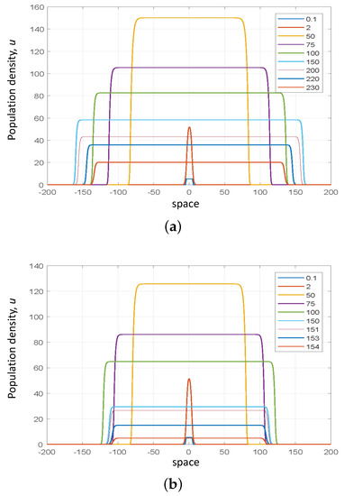 Apparently, the rate of increase in the total number of protesters depends on the speed of the travelling peak. That raises an interesting mathematical question as to whether the speed can be estimated. We recall here that, in reaction-diffusion systems, the travelling wave usually arises as a heteroclinic connection between two equilibria (homoclinic in the case of a travelling peak) in the phase space of the system, the speed of the travelling wave being an eigenvalue of the corresponding nonlinear problem [39,42,43]. Our system (12) and (13) does not quite fit into this framework, as a positive equilibrium does not exist for . This indicates that, in a strict mathematical sense, the travelling wave does not exist. However, arguably, the part of the solution that describes the peak still behaves as a travelling wave, as indeed is readily seen from the properties of the numerical solution, e.g., see Figure 8 and Figure 10. Hence, we hypothesize that some of the tools normally used to estimate the speed of the wave may still be applicable.