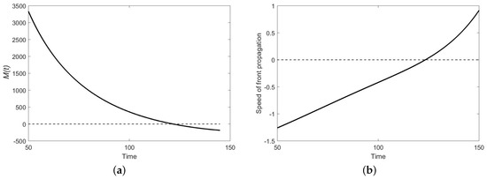 Dependence on time of (a) M and (b) the speed of the front calculated in the course of the travelling front propagation. The parameters are the same as in Figure 5a. It is readily seen that the moment () when the front changes the direction of its propagation (invasion changes to retreat) coincides with the moment when M changes its sign.