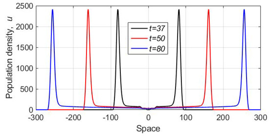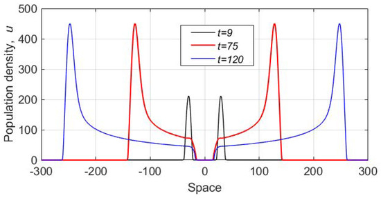 As we observed in numerous numerical simulations, the main properties of the solution, such as the formation of the population peaks propagating away from the location of the initial distribution, were generic and robust to parameter changes. In particular, we did not observe any significant changes in the system dynamics for different values of the diffusivity ratio (having checked several values of the ratio in the range between one and 0.01). However, some quantitative features of the dynamics appeared to be somewhat sensitive to other parameter values. For instance, the height of the peak depended on rather strongly. An example shown in Figure 10 is obtained for . We readily observe that, whilst the dynamics is qualitatively the same as in the case (see Figure 8), the height of the peak is almost an order of magnitude smaller. The speed of the peak propagation is slightly less as well. The distribution of damage, however, shows features similar to what was obtained for (see Figure 9); we do not show it here for the sake of brevity.