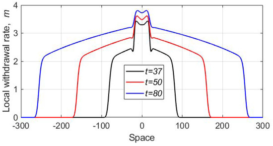 where x is the position in space, , D is the diffusion coefficient, and the dependence of the withdrawal rate m on time is given by Equation (5).