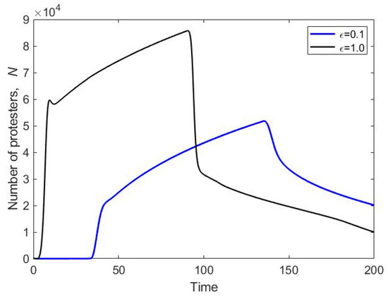 The behaviour of the solution of Model (7) is thus apparently similar to that of the solution of the single component Model (1) and (2); cf. Figure 2. There are, however, some important differences. In Model (1) and (2), there exists a finite critical value , so that for , the number of protesters never falls to the small equilibrium value, but stabilizes at the higher steady state (see Curve 1 in Figure 2a). On the contrary, in Model (7), there is no finite critical value: for any , the solution will eventually converge to the lower steady state. We also note here that the shape of the graph of shown in Figure 4a, albeit similar to Figure 2, is not the effect of the ghost attractor, but a property of the so-called slow fast dynamics (when ) [31].