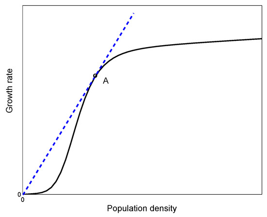 However, the expression (17) appears to be in bad disagreement with numerical results predicting a value considerably less than was obtained in the simulations, e.g., two instead of 3.1 for the parameters of Figure 8. Even worse, it does not in any way predict the dependence of the speed on parameter values: for instance, for Expression (17) gives , whilst the actual value is about 2.6. A more careful look readily reveals the reason for this disagreement: as a matter of fact, Expression (17) is hardly relevant at all as its validity is limited to the case where the growth function is convex [42,43], whilst in our case, it is not (see Figure 12).