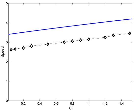 Dependence of the speed of the travelling peak on ; diamonds show the numerical results, and the blue line shows the analytical estimate (24).