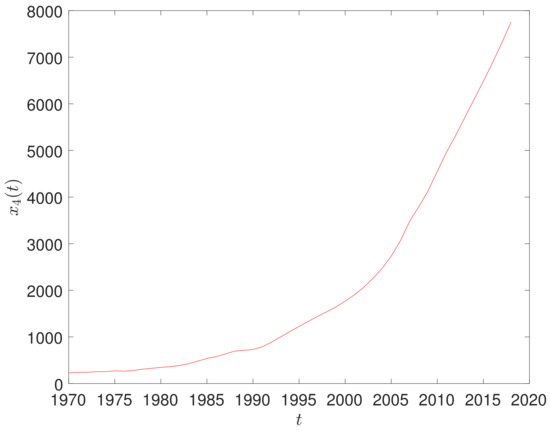 A classical method for analyzing the dynamics consists of the PS. For example, Figure 1 and Figure 2 depict the GDP of China versus time, , and the corresponding 2- and 3-dim PS during years 1970–2018.