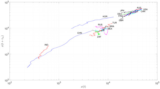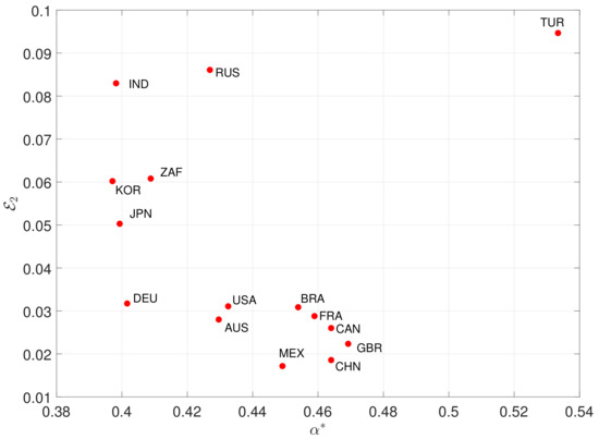 Figure 9 depicts versus , revealing three clusters that comprise {IND, RUS, TUR}, {JPN, KOR, ZAF}, and {AUS, BRA, CAN, CHN, FRA, DEU, MEX, GBR, USA}, respectively. We verify the small values of particularly for the third (and larger) set of countries.