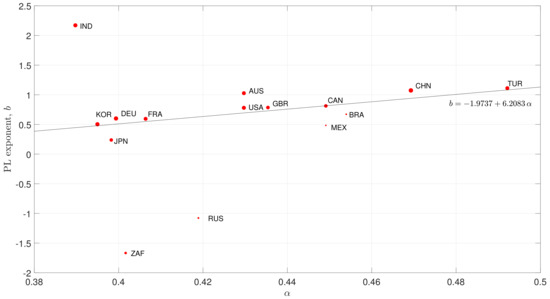 In a different perspective, we approximate the PPS by means of power law functions, , using a non-linear least-squares fit algorithm. We verify that the parameters b are correlated with , as shown in Figure 5, reflecting the fractional behavior of the economy dynamics. With the exception of IND, RUS and ZAF, we verify an almost linear correlation given by for the rest of the countries.