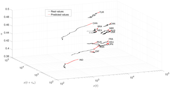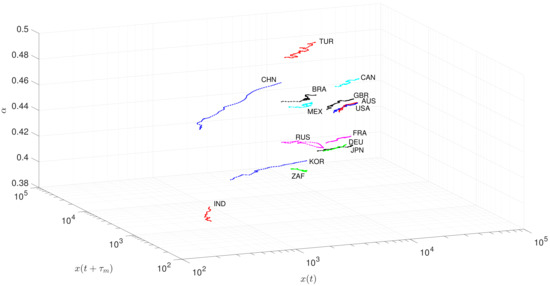 The usual PPS portrait requires the calculation of , but lacks giving assertive information about the memory embedded in the TS. Since a heuristic relationship between and was formulated previously, we expand the PPS by including the fractional dynamics information. Figure 6 shows the 3-dim locus for the 15 countries during 1970–2018. This 3-dim locus extends the usual 2-dim PPS, by placing and in the x- and y-axes, respectively, and in the z-axis. We find countries exhibiting slow dynamics (i.e., low ) in the bottom (e.g., IND, JPN, and KOR), and countries with fast dynamics (i.e., high ) in the top (e.g., BRA, CHN, and TUR).