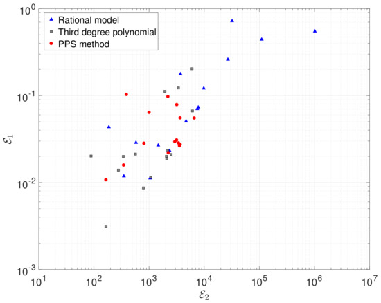 Figure 8 depicts the locus of the errors obtained with the PPS method and Equations (12) and (13). We verify that the PPS method does not lead always to the best prediction. This result was expected since Equations (12) and (13) were chosen as the best between a large number of possible functions, while the PPS-based estimation is just a byproduct of the relationship between the time delay and the fractional order. Nonetheless, we must note that the PPS method yields values of and in the narrower interval, being more robust to the variations between the distinct country GDP per capita.