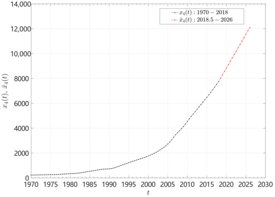 We estimate GDP per capita of the set of 15 countries up to the maximum accomplished by the PPS method. This means that we have distinct prediction horizons for each country, going from 2024 for TUR up to 2042.5 for IND, as listed in Table 3. Figure 10 depicts the GDP per capita of China versus time. For this country we have years and, therefore, we have real and estimation data for the periods 1970–2018 and 2018.5–2026, respectively. Figure 11 illustrates the real and estimated PPS for all countries. Again, we verify that the PPS representation produces good evolution without abrupt changes or uncommon behavior.