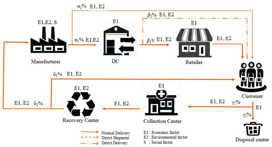 Among the major trends in CLSC design problems, the principle of sustainable development has become popular in conventional literatures [1,2,3,4,5,6,7,8,9,10,11,12,13,14,15,16,17,18,19,20,21,22,23]. According to this principle, economic, environmental, and social factors are usually considered for effectively constructing a sustainable CLSC (SCLSC) design problem.
