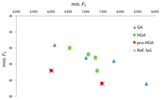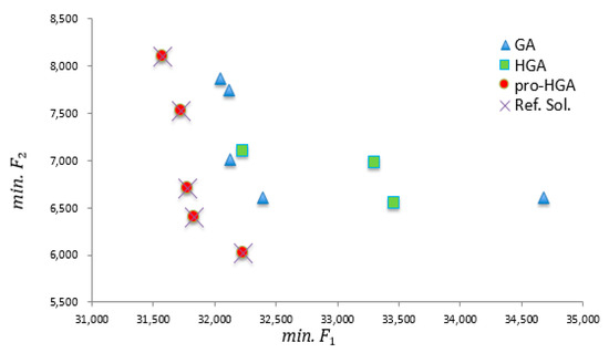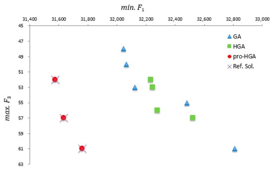 From Figure 2, it is evident that five Pareto optimal solutions obtained via the pro-HGA approach coincide with the S*, and that the GA and HGA approaches do not show any advantages compared to it in this regard. Similar results are observed regarding the number of Pareto optimal solutions in terms of |Sj| for Problem 1 as presented in Table 8. Similar situations are also depicted in Figure 3 and Figure 4. The pro-HGA approach exhibits two Pareto optimal solutions in Figure 3 and three solutions in Figure 4 that coincide with those of S*, but none of the solutions obtained via the GA and HGA approaches coincide in position with elements of S*.