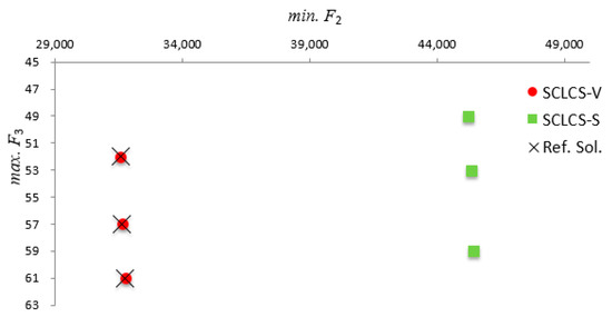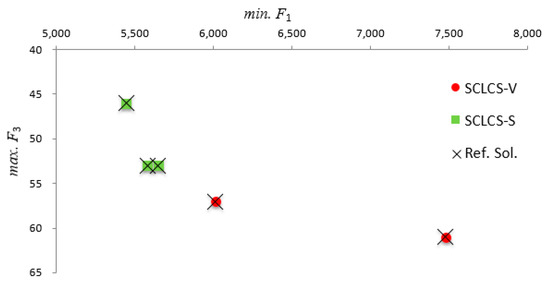 From Figure 5, it is evident that four Pareto optimal solutions out of five coincide with S* for SCLSC-V, while the same is true for two out of seven solutions for SCLSC-S. These results are the same as the distributions of Pareto optimal solutions in terms of |Sj| for Problem 1 as presented in Table 10. From Figure 6, we can observe that all Pareto optimal solutions for SCLSC-V and SCLSC-S coincide with S*. However, in Figure 7, all Pareto optimal solutions for SCLSC-V coincide with S*, but none of the solutions for the SCLSC-S do.