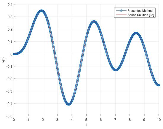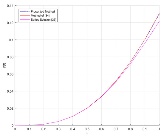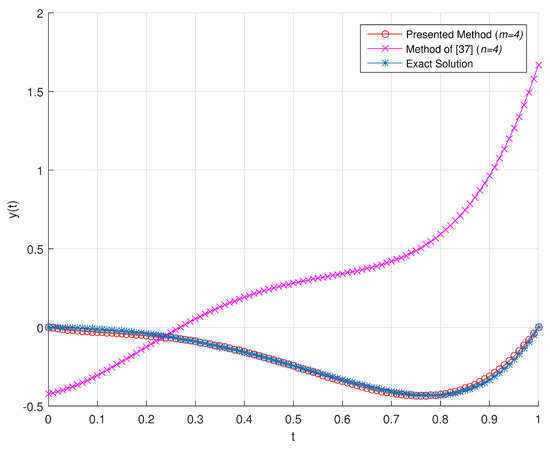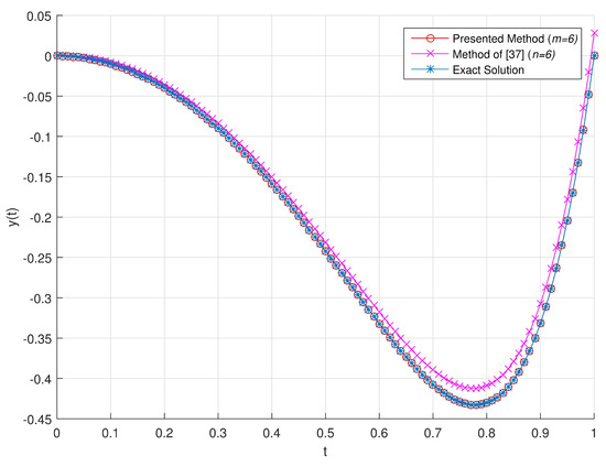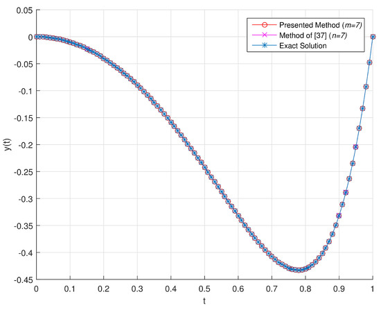 Table 9 lists the exact and obtained numerical solutions by use of presented method and method of [63] for the given problem for . Comparison of this results shows that, even for small values of m, the numerical solution obtained by use of presented method is in a better agreement with exact solution.