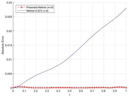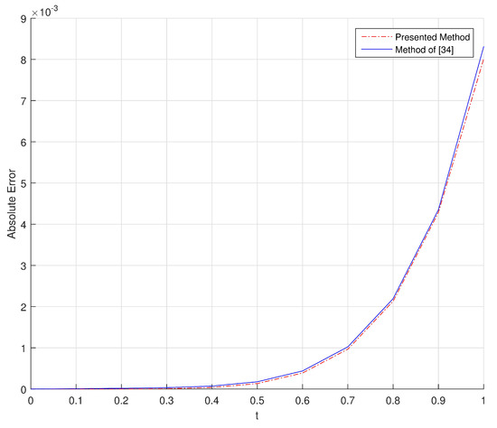 In Figure 4, we show the graphical representation of absolute errors obtained by using proposed method and the method of [59] with .