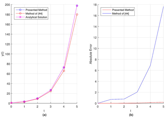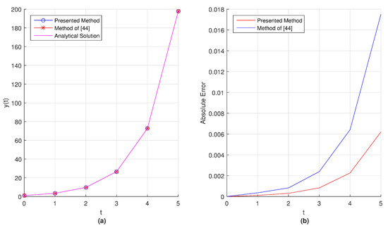 (a) The comparison of analytical solution and numerical solutions obtained by the proposed method and the method of [63] with . (b) The behaviour of the absolute errors between the exact solution and numerical solutions obtained by our method and the method given in [63] with .