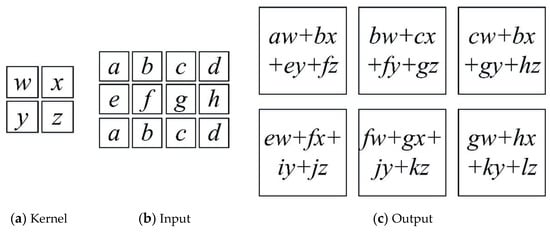 Here, the activation function is used to enhance the network’s nonlinearity. Currently, ReLU [] is the most popular activation function that leads to notably rapid convergence and robustness in terms of gradient vanishing []. Figure 6 presents the convolution procedure.