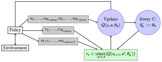 The parameter, which defines the values of the Q function at the iteration, will be updated only every iteration to keep the stability and diminish the risk of divergence. In order to bound the instabilities, DQN uses two heuristics, i.e., the target Q-network and the replay memory []. Additionally, DQN takes the advantage of other heuristics such as clipping the rewards for maintaining reasonable target values and for ensuring proper learning. An interesting aspect of DQN is that a variety of deep learning techniques are used to practically improve its performance such as the preprocessing step of the inputs, convolutional layers, and the optimization (stochastic gradient descent) []. We show the general scheme of the DQN algorithm [] in Figure 9.
