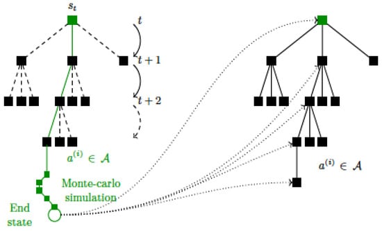 When the explicit model is not known, it can be learned from experience by the function approximators [,,]. The model plays the actual environment role to recommend an action. The common approach in the case of discrete actions is look ahead search, and trajectory optimization can be utilized in a continuous case. A lookahead search is to generate potential trajectories with the difficulty of exploration and exploitation trade-off in sampling trajectories. The popular approaches for lookahead search are Monte Carlo tree search (MCTS) methods such that the MCTS algorithm recommends an action (see Figure 9). Recently, instead of using explicit tree search techniques, learning an end-to-end model was developed [] with improved sample efficiency and performance as well. Lookahead search techniques are useless in a continuous environment. Another approach is PILCO, i.e., apply Gaussian processes in order to produce a probabilistic model with reasonable sample efficiency []. However, the gaussian processes are reliable only in low-dimensional problems. One can take the benefit of the generalization capabilities of DL approaches to build the model of the environment in higher dimensions. For example, a DNN can be utilized in a latent state space []. Another approach aims at leveraging the trajectory optimization such as guided policy search [] by taking a few sequences of actions and then learns the policy from these sequences. The illustration of the MCTS process is presented in Figure 10 and was adopted from [].