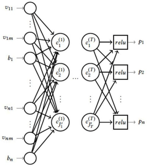 where and indicate the coefficient matrices for the input in the current state and the activation of recurrent hidden units at the prior step, respectively. is the bias vector. Therefore, the output at time is presented as Equation (7):