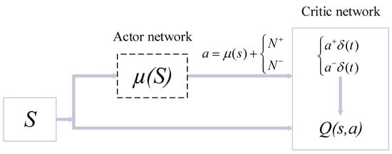 An actor–critic architecture is a common approach where the actor updates the policy distribution with policy gradients, and the critic estimates the value function for the current policy [], Equation (21).