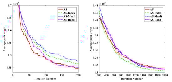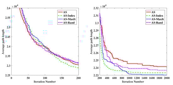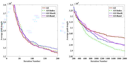 According to Figure 1, AS shows faster convergence speed than the other three proposed methods in early iterations, while AS-Index, AS-MaxIt, and AS-Rand all surpass AS in average path length in later iterations. Meanwhile, AS-MaxIt performs best among all these algorithms, which also verifies the results in Table 1.