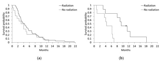 Survival curves for the arms with and without radiation during surgery: (a) pancreatic head subgroup; (b) “other” subgroup.