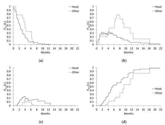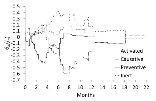 Next, we applied the approach proposed in this article. Figure 2 shows in each subgroup when the cut-off point was changed from 0 to 21.6 (months). The proportions of activated and inert subjects decreased and increased monotonically over time, respectively, as shown in Figure 2a,d; this is to be expected given Proposition 2. Figure 2b shows that the proportion of causative subjects is lower in the pancreatic head subgroup than in the other subgroup. Figure 2c shows that the proportion of preventive subjects was small, especially in the other subgroup. Figure 3 shows the differences in the estimated proportions between the two subgroups; i.e., in (7). In Figure 3, we can clearly see that the cancer site is “depleted-activated” until approximately six months. Then, over the period from 6 to 12 months, the cancer site is “depleted-causative.”