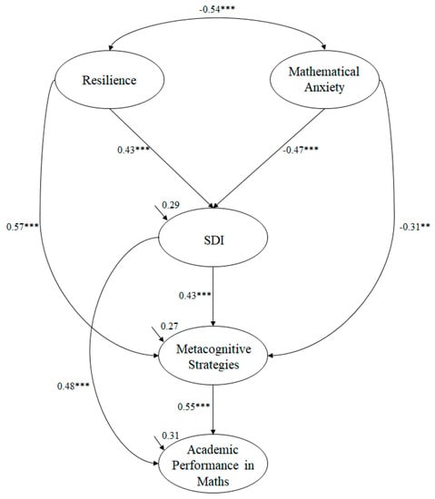 - Mathematical anxiety was negatively related to SDI (β = −0.47, p < 0.001) and metacognitive strategies (β = −0.31, p < 0.01).