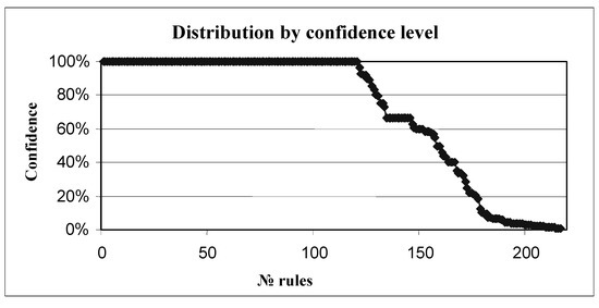 As can be seen, the From, To, and Pallets axes belonged to the second category (we cannot control these fields), while the CarrierType, Depot, VehicleType, and Orders axes were situated in the first category. The developed solution of adaptive clustering found 218 rules. The spreading of their confidence level is presented in Figure 5.