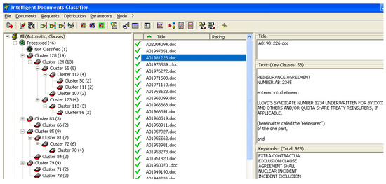 At the next stage, this multi-agent clustering solution was deployed for industrial applications. The processing of approximately 25,000 car insurance contracts (each consisting of 30 pages) can take about 16 person-years. It was done by the system in about 4 person-months, saving time and money for the client.