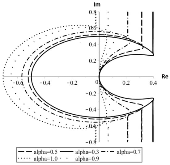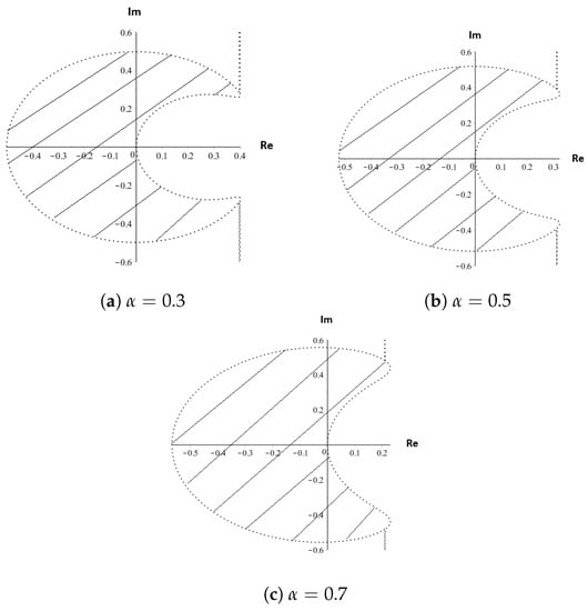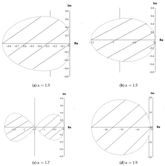 As mentioned before, we take into consideration whether every root of is real and must satisfy . Therefore, Equation (26) proved to be stable inside the shaded region as shown in Figure 3 when . According to Figure 3, it shows that the region for higher order FDE also became larger as the increased and approached 2. The regions are shown to become larger in the left imaginary axis and symmetric to the real axis.