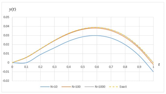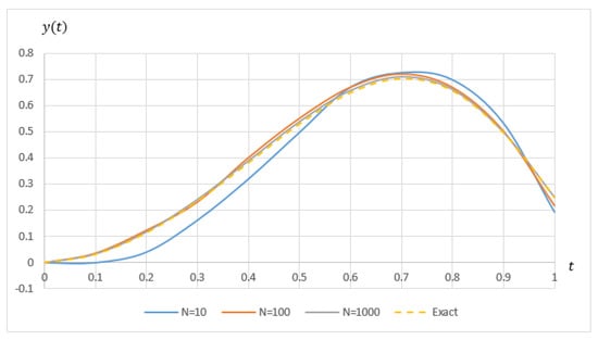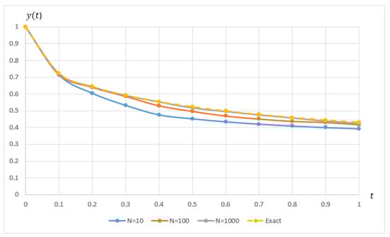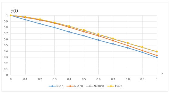 In addition, the numerical results for solving initial value problem of higher order FDE are tabulated in Table 6 in the form of absolute error when as . The table proved that FEAM3 is also able to perform well in solving nonlinear FDE, where the absolute error decreases when increases and h decreases. On the other hand, Table 7 shows the absolute error of various at different h between FEAM3 and ATPC for solving nonlinear FDE of Example 3, where FEAM3 is able to obtain a comparable result as the existing method, ATPC. Additionally, the graph of approximate solution at each point, t, for solving Example 3 when for different N is shown in Figure 7. The graph highlights that the approximate solution does indeed approach the exact solution as increases.