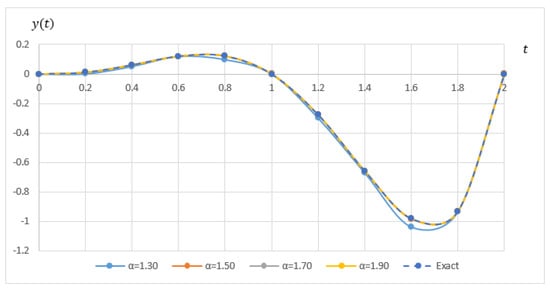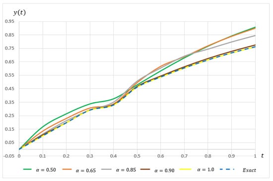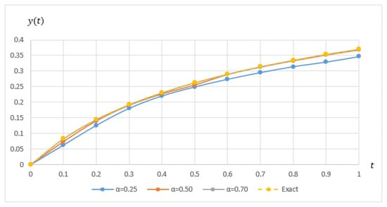 In literature, several analytical and numerical methods have been developed over the past few decades, namely the variational iteration method [,], homotopy perturbation method [,] and the Adams–Bashforth–Moulton method [] to solve the fractional differential and integral equations. However, in some cases, solving differential equations numerically has proven to be more efficient and convenient compared to analytical solutions especially when dealing with huge and complex problems. Therefore, many researchers have developed numerous numerical methods to solve various kinds of differential equations. For example, research by Podlunby [] used the first order finite difference numerical method and managed to solve FDE problems with accuracy. Following that, Gorenflo [] proposed a second order difference method to solve FDE and managed to achieve the desired accuracy. Another well-known numerical method of a predictor–corrector type has been developed by Diethelm et al. [] In the study, they developed an algorithm of (Predict–Evaluate–Correct–Evaluate) where m is the number of iterations to solve linear and nonlinear FDE. In addition, Galeone and Garrappa [] present a study on multistep methods for differential equations of fractional order that concerns numerical treatment of FDE on both implicit and explicit types. They managed to prove that explicit methods in the treatment of FDE give a good numerical solution with good stability analysis. Later, Blaszczyk and Leszczynski [] proposed a study on FDE of higher order with a mixture of integer and Caputo derivatives using Euler’s method. They modified the discrete form of the Caputo derivative being dependent on a range of the parameter, and found that, when the range increases, the number of discrete equations occurring in the algorithm also increases.