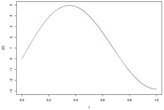 From Table 1, Table 2 and Table 3 and Figure 1 and Figure 2 we can see that: (1) The biases of , and are fairly small for almost all cases. (2) The standard deviation of , and decrease as either R or q increases. (3) The RASEs of are small for all cases and decrease as sample size n increases or decreases, and it can be concluded that the estimate curves fit better to the corresponding true line, which coincides with what was discovered from Figure 1 and Figure 2. Overall, the simulation results suggest that the proposed estimation procedure is effective for the partial functional linear spatial autoregressive model.