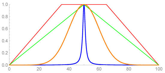 Mathematical expressions describing membership functions (2) and (3) have presented in Figure 2. The colors green, red, orange and blue illustrate a triangular MF defined by triangular number = (0, 50, 100) a trapezoidal MF defined by trapezoidal number (a, b, c, d) = (0, 30, 70, 100), the Gaussian MF (σ = 4, c = 50) and a generalized Bell MF (b = 1, a = 4, c = 50), respectively.
