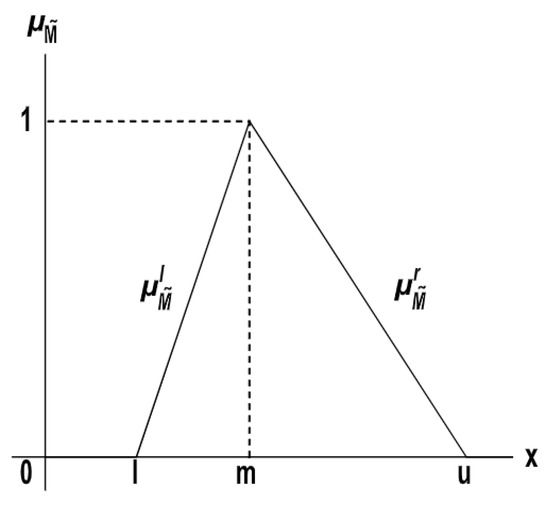 Let represents all fuzzy sets defined on the set of real numbers and let . The number [47] is a fuzzy number if there exists so it holds and for every , is a closed interval. To define a triangle fuzzy number M, it is required for the membership function to be a function , defined as