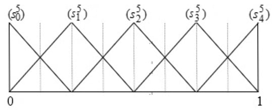 Suppose that  is an ordered linguistic term set; g is the number used to represent the index of maximum linguistic variable in linguistic term set S;  are linguistic variables. A 2-tuple linguistic variable (L) can be expressed by two elements as ( in accordance with the linguistic term set. The symbol  is the central value of the ith linguistic variable in S, and symbol  is the difference in values between L and the ith linguistic variable in S. Before the operation of 2-tuple linguistic variables, we must transform 2-tuple linguistic variables into crisp values. For the same reason, we can transform a crisp value into a 2-tuple linguistic variable to be expressed as a triangular fuzzy number. Applying the translation function , we can easily transform a crisp value β into a 2-tuple linguistic variable []. In this paper, the generalized translation function can be applied as []: