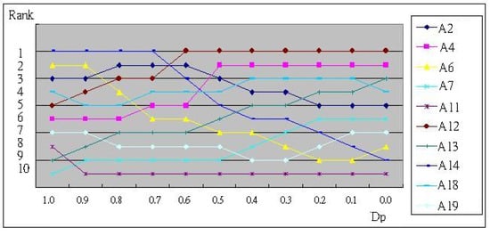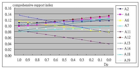 If the preference index of the final decision-maker changes, then the comprehensive support index of each qualified applicant will be different as Figure 7. In addition, the ranking order of qualified applicants will change in accordance with  as Figure 8. As we know, the final decision-maker can select the suitable applicants flexibly with a different preference index ().