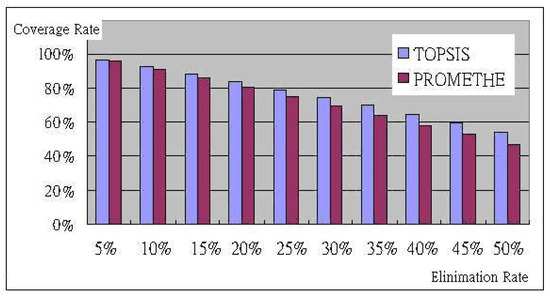 (4) In this research, the elimination ratios and coverage rates have a trade-off relationship. Enterprises can use the proposed method by justifying that the elimination ratios save decision makers’ time according to the enterprises’ actual demand.