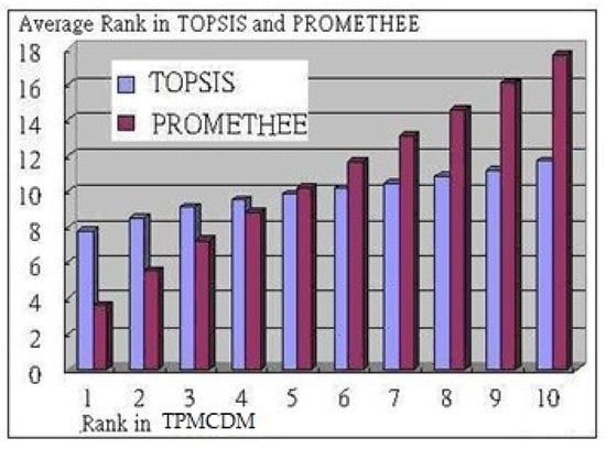 The average rank of selected applicants by two-phase multi-criteria decision-making (TPMCDM) are computed in linguistic TOPSIS and preference ranking organization method for enrichment evaluation (PROMETHEE).