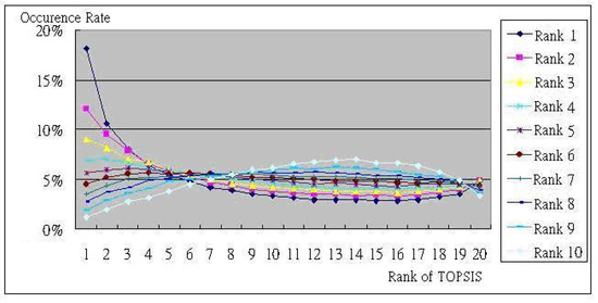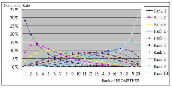 The average rank order of each selected applicant by the TPMCDM method is computed to compare with the linguistic TOPSIS and linguistic PROMETHEE methods, respectively. According to experiment result (shown as Figure 10), we know that a lower rank order of the applicant in the TPMCDM method acquires a lower average rank order in the L-TOPSIS and L-PROMETHEE methods, respectively. The rank order distribution of each selected applicant by the TPMCDM method is also computed in the linguistic TOPSIS method as Figure 11. The rank order distribution of each selected applicant by the TPMCDM method is also computed in the linguistic PROMETHEE method as Figure 12. Based on the above analysis results, we find that the TPMCDM method can help managers to select suitable employees and can effectively reduce the interview time and cost during the process of personnel recruitment.