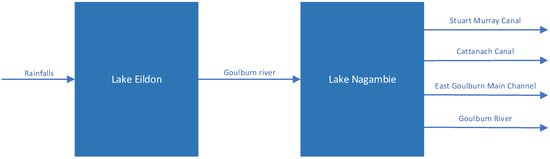 The scheme of the Goulburn River cascade is presented in Figure 1. We assume that the water level of Lake Eildon is affected by two major flows. One is the incoming flow, which reflects the sum of all the natural water arrivals and losses, including precipitation, upstream tributaries, evaporation, and other causes. The single outcoming flow is the controlled discharge of the Goulburn River, which also serves as the single incoming flow of Lake Nagambie (other natural inflows and outflows into this lake are ignored here due to a significant difference in the size of the two lakes). From Lake Nagambie, there are four controlled discharges, namely the Stuart Murray Canal, Cattanach Canal, East Goulburn Main Channel, and the Goulburn River.