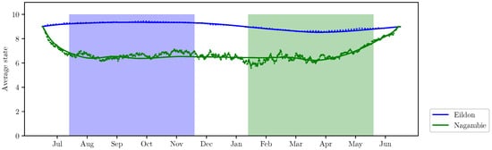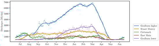 In previous subsections, the Goulburn River cascade model was defined in general. Nevertheless, there still are some undefined parameters, which will be specified using real-world data. To define the reference demand values , , , , we use the data on the discharges of the corresponding channels and river available from the Water Measurement Information System of the Department of Environment, Land, Water & Planning of Victoria State Government []. The data on the daily discharges was grouped by the day of year, and for each group, the mean value was calculated. The resulting time series were approximated by functions