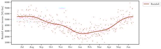 The data for the Lake Eildon incoming flow is obtained from the Climate Data Online service of the Bureau of Meteorology of the Australian Government []. The rainfall data is collected at the weather station situated there. This data is averaged on a daily basis and approximated by a smooth periodic function in the same way as the daily discharges. The resulting function serves as an incoming flow pattern . For this model, we assume that the irrigation demands agree with the total available natural resources, so the incoming flow pattern is normalized to make the incoming flow satisfy the following condition: