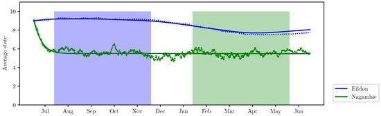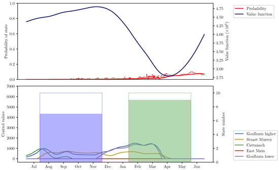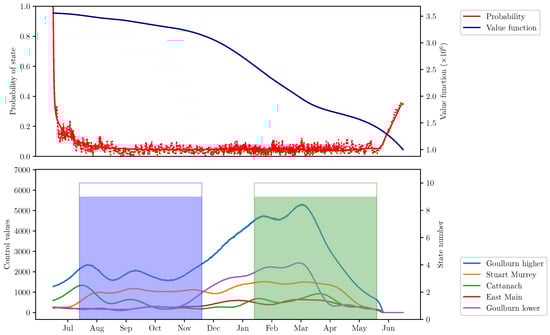 The Kolmogorov Equation (15) allows us to calculate the probabilities of the global system states given the initial state or distribution. The probabilities for states and are presented in Figure 4 and Figure 5 on the upper subplots. The initial state here was chosen to be equal to the terminal . The solid red lines present the solution of (15), and the dotted lines are the result of Monte-Carlo sampling: the state rate was estimated using a set of 100 sample paths governed by the optimal control strategy. The state probabilities allow us to also calculate the average states of MCs, which can be converted into the average levels of Lakes Eildon and Nagambie. In Figure 6, the average levels calculated by means of the Kolmogorov Equation (15) are presented by solid lines. The corresponding averages calculated using the Monte-Carlo sampling are depicted with dotted lines.
