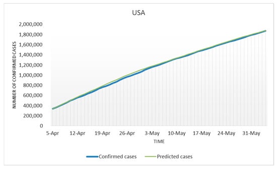 As a result of applying the iterative procedure for generating the trajectory for the USA using the CBRR model, the following forecast for the time period 5 April–4 June 2020 was built (Figure 2 and Figure 3). Average deviation of the real-time trajectory of the total number of infected from the one predicted was 0.23%. Standard deviation for the considered time period was 3.9%.