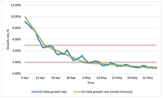Growth rate over the considered time period in the USA (real-world data and model forecast). Red dotted lines correspond to the growth rates of 5% and 2%.