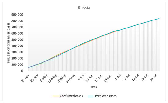 The result of the experiment on the use of the CBRR model for predicting the trajectory of the percentage increase rate and the absolute number of confirmed cases during the time period from 20 April to 31 July 2020 is shown in the graphs (Figure 4 and Figure 5). The predicted dynamics is compared with the actual dynamics provided in the official statistical reports. The average deviation of the predicted trajectory of the number of confirmed cases from the actual one in the time period from 20 April 2020 to 31 July 2020 is 0.28%. The standard deviation for the considered time period was 3.7%.